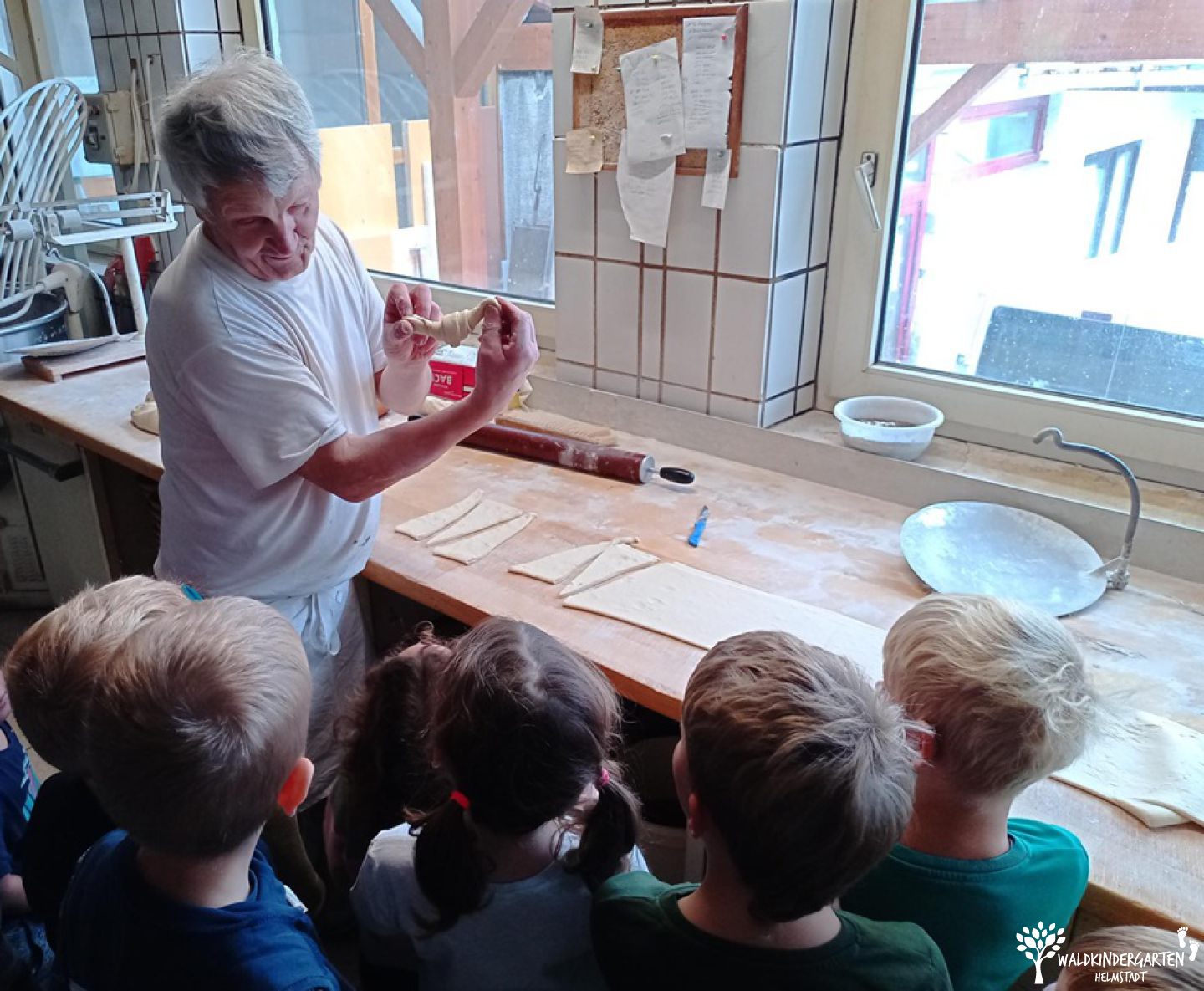 In der Kirche erfuhren wir, was alles zu Erntedank geerntet wird und welche Produkte aus den verschiedenen Rohstoffen entstehen. Besonders beeindruckte uns das Brot, das dort ausgestellt war. Daraus entwickelte sich unser nächstes Highlight: der Besuch in der Bäckerei Schäfer. In der Backstube sahen wir, wie viel Mehl für Croissants und Brötchen benötigt wird, und durften sogar selbst ausprobieren, wie man kleine Croissants in den Ofen schiebt und wieder herausholt.